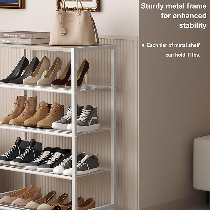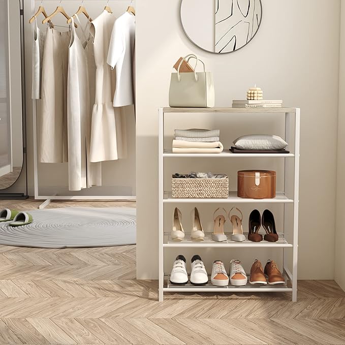 - Ample Storage Capacity: Each shelf can fit around three pairs of regular shoes. The top flat table makes this shoe organizer more stylish and attractive. You can place a mail basket, purse, backpack, or hand sanitizer on the tabletop.