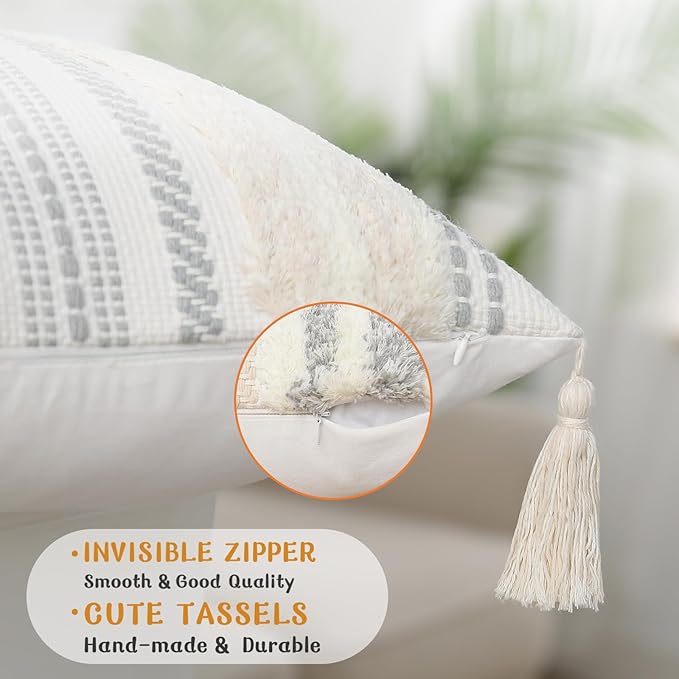 - Stylish Boho Design: Throw pillow covers for couch own unique designs and look multi-textured. There is a woven rope pattern in the center, as well as the outer edges. In between those areas are very soft tufting with two colors. The corners are accented with hand-made tassels, which are cute and do not easy to fall off