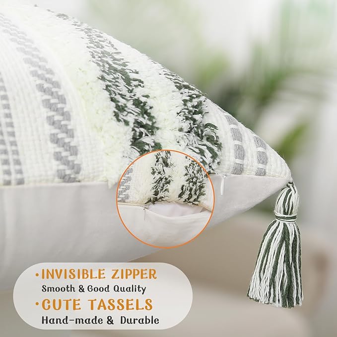 decorUhome Decorative Boho Throw Pillow Cover 18x18, Accent Neutral Textured Tufted Pillow Cover Striped for Couch Bed Sofa, Green and Cream White, Pack of 1