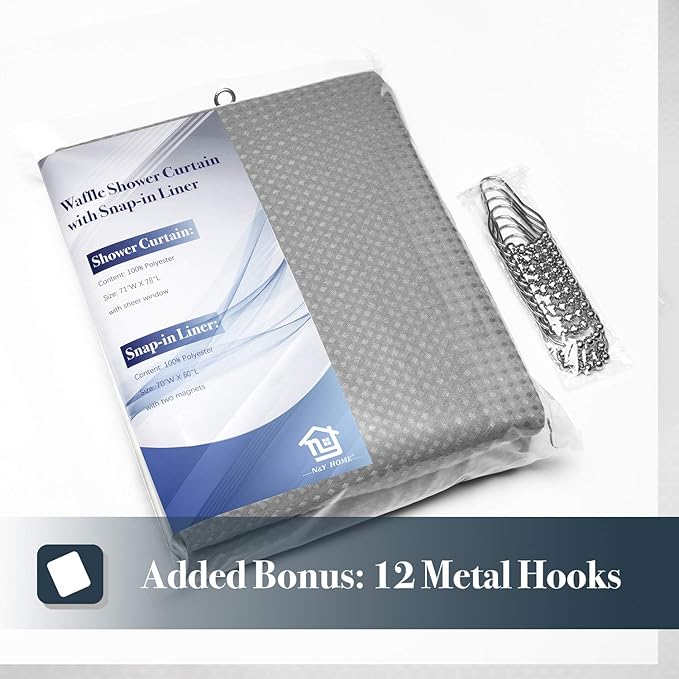 - Smart Design Set & Hotel Style: Waffle weave shower curtain with detachable liner of the same color, and free 12 rust resistant hooks, the entire 3-in1 set offers a complete solution for bathtub or stall