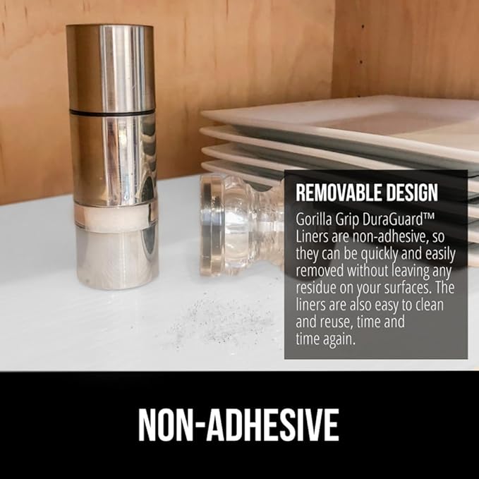 - STRONG GRIP: the Gorilla Grip DuraGuard shelf liner is a durable non adhesive liner designed to stay firmly in place on shelves, drawers and cabinets; will also help keep your items in place; they help to prevent dishware and other fragile items from shifting; designed to help reduce slipping and bunching in your drawers and cabinets