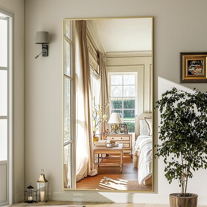 GLSLAND 71"x31" Full Length Mirror Extra Large Hanging or Leaning Rectangle Mirror Aluminum Alloy Thin Frame Bedroom Floor Dressing,Gold