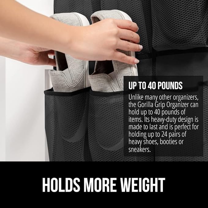 GORILLA GRIP Over the Door Shoe Organizer, 2 Pack, 24 Breathable Mesh Pockets, Space Saving Hanging Storage Holder, Closet Rack Hanger Holds Up to 40 lbs, Hangs on Closets, Shoes, Accessories, Black