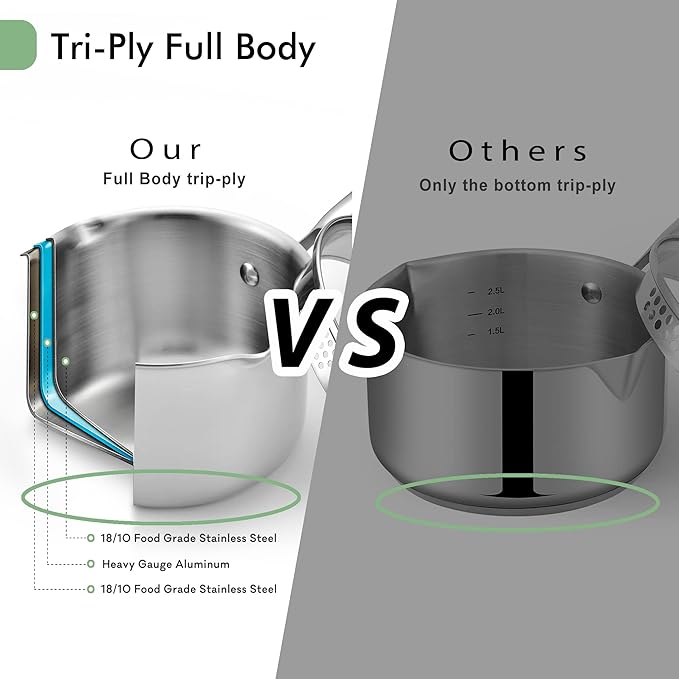 - Top Quality: Cook with confidence using our top-quality 3 quart saucepan. Made from heavy gauge 18/10 stainless steel, it's non-toxic and won't react with your food. Plus, measurement marks inside make it easy to read.