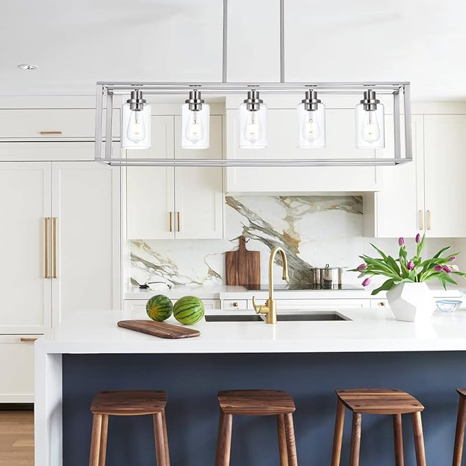 - Design:This Contemporary 5 light kitchen island light features combines geometric metal frame with clear cylindrical clear glass shade in a beautiful brushed nickel.