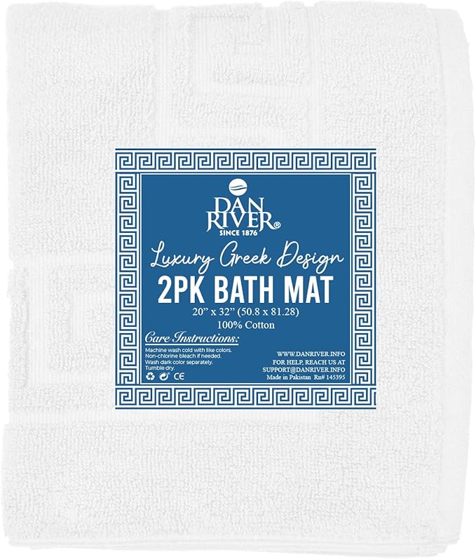 DAN RIVER Greek Bath Mat - White, 100% Ring Spun Cotton, Pack of 2, 20x32 inches, 800 GSM, Non-Slip, Absorbent, Quick Drying, Machine Washable Bathroom Floor Mats for Shower, Kitchen & Bath