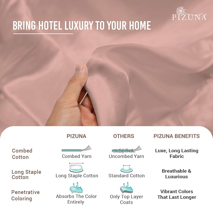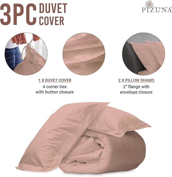 Pizuna Pure 100% Cotton Queen Duvet Cover Set, Luxurious 400 Thread Count Long Staple Cotton Sateen Weave with Button Closure (Combed Rose Pink Cotton Duvet Cover Queen)