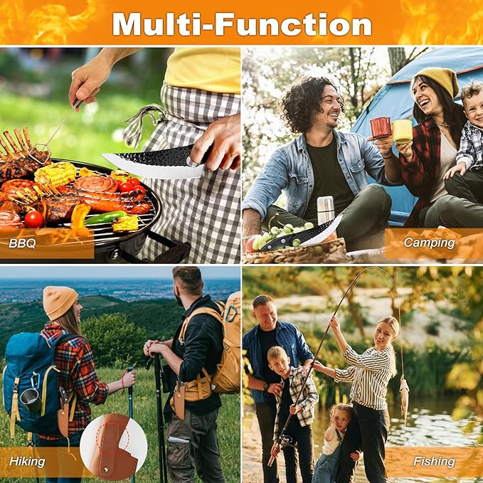 - Unique Leather Sheath: The outdoor chef knife is equipped with a practical soft leather sheath to protect the blade. You can put a belt on it for easy carrying when camping outdoor. The portable camping knife is your ideal assistant for Butchering, Fishing, Camping, and Outdoor BBQ activities.