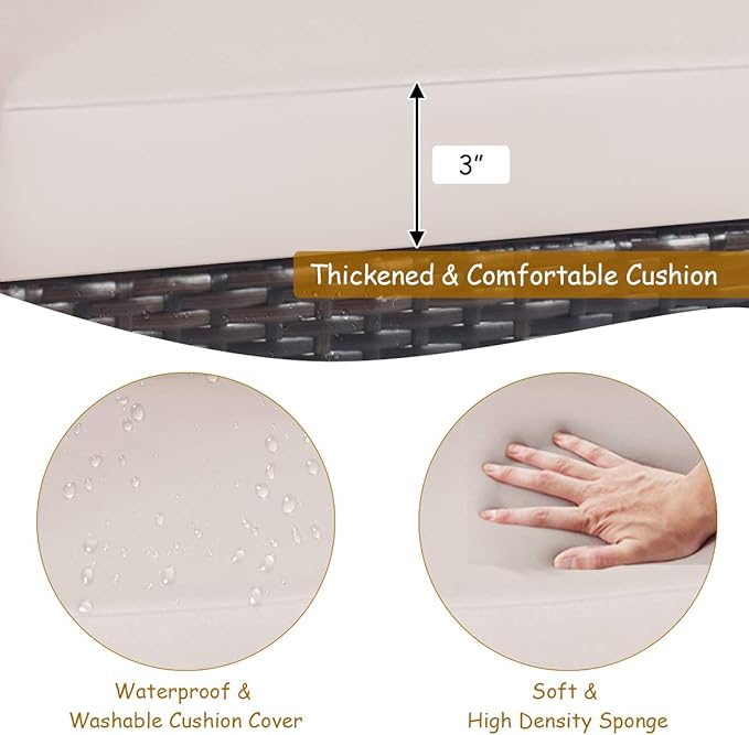 - Comfort with Thick Cushion: This rattan furniture set chair has a large-sized seat and a wide backrest, so that you can relax your body and relieve the fatigue of the day. Most importantly, we will also provide soft and thick cushions, these removable and washable cushions provide ultimate comfort to your back and hip.