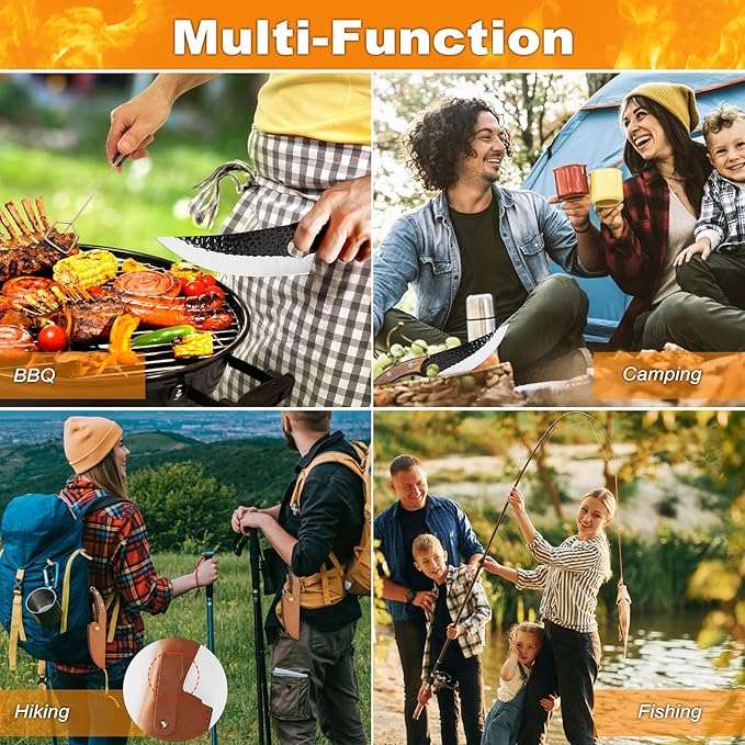 - Unique Leather Sheath: The outdoor chef knife is equipped with a practical soft leather sheath to protect the blade. You can put a belt on it for easy carrying when camping outdoor. The portable camping knife is your ideal assistant for Butchering, Fishing, Camping, and Outdoor BBQ activities.