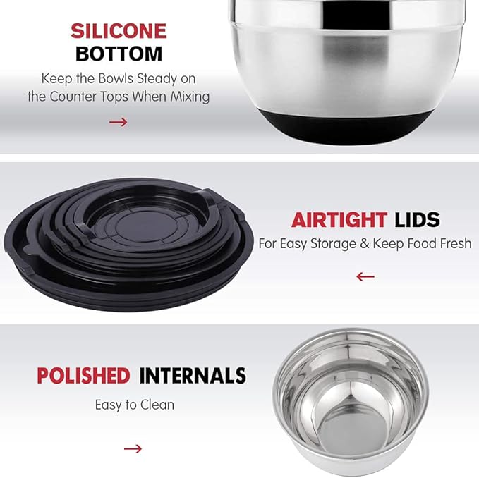 - [MULTIFUNCTION & EASY CLEAN] Steel bowls are prefect to mix, toss salads, stir, whip, knead dough, marinate and store. Ideal present for New home, Easter, Thanksgiving Day, Christmas or any occasion. Simple to clean by hand and dishwasher safe. Please hand-wash the lids to minimize exposure to heat.