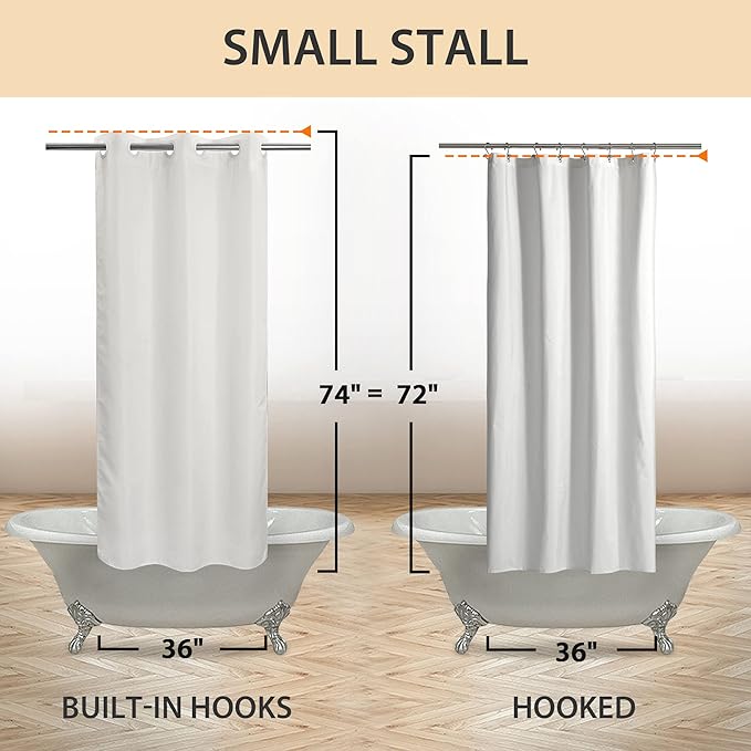 - NO HOOKS NEEDED: Designed with built-in "Split Rings" for effortlessly installing & removing within seconds, time saving and no additional hooks needed, 36x74(same size as 36x72 hooked shower curtain) fits with small stall size