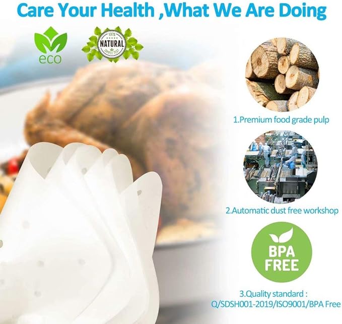 - 4【Rest from Cleaning】 Prevent the residues and Oil stains from dripping into the pan because the streamer paper liners waterproof and greaseproof, which avoid cleaning your air fryer hardly, again and again, keep it as new always