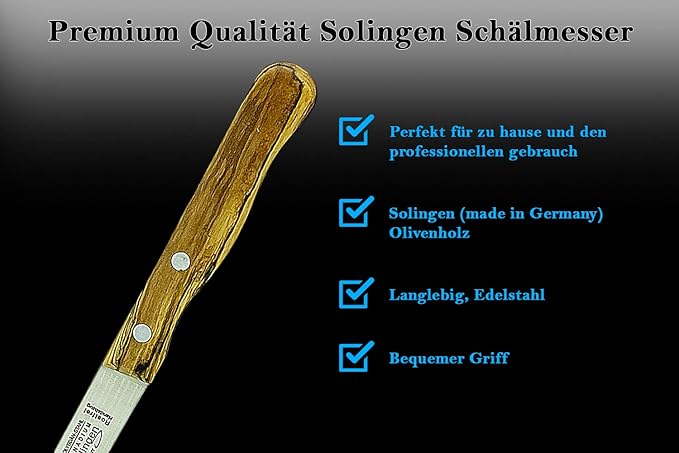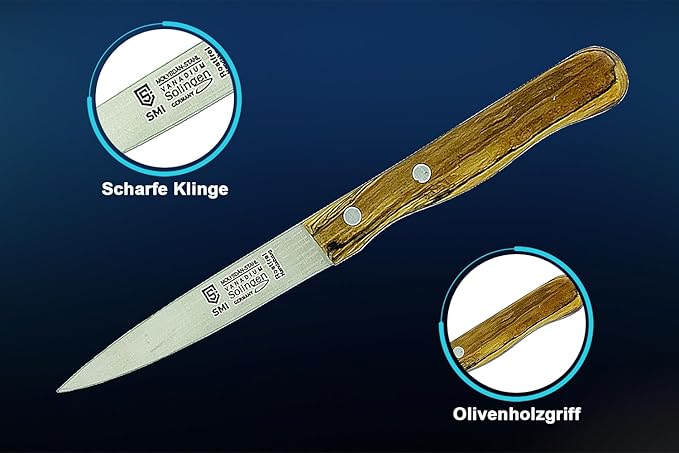 SMI - Paring Knife Fruit Knife Vegetable Knife Olive Wooden Handle Stainless Steel Solingen Knife Made in Germany - Not Dishwasher Safe