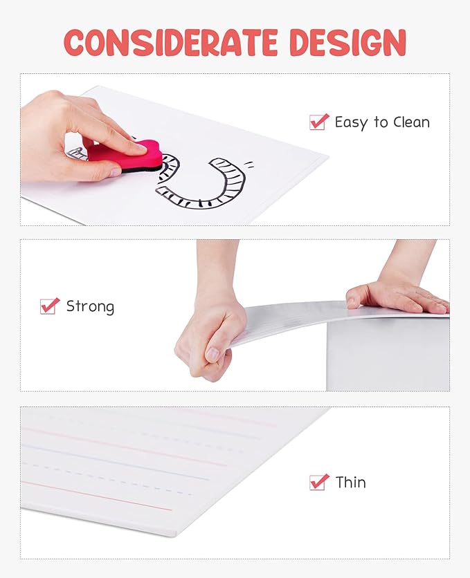 - Solid and Easy to Clean: Crafted from lightweight yet durable materials, these personal whiteboards feature a high-quality PET surface that is easy to wipe clean with the included erasers or a cloth. Pre-treat the surface using a soft, clean, moist cloth, and for tougher stains, simply clean with mild soap and water