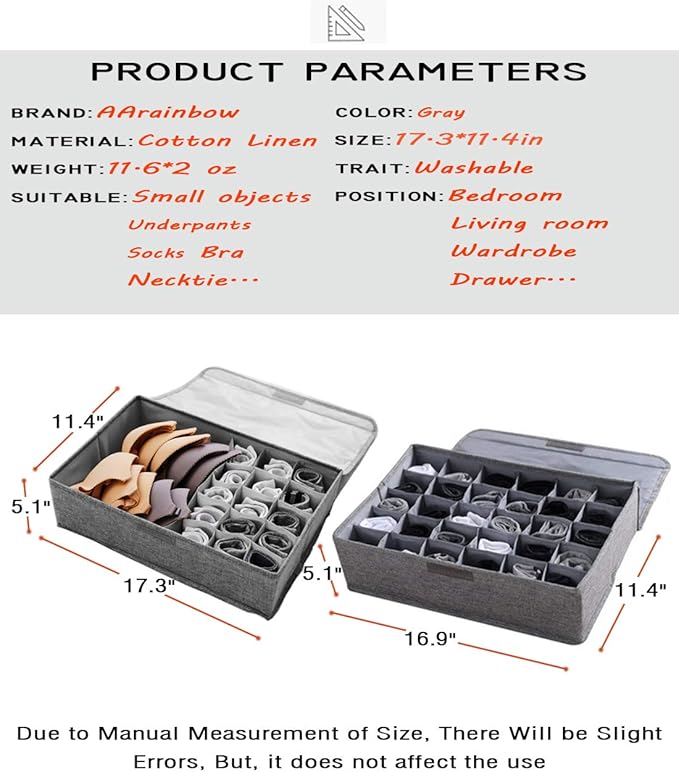 - 👍【2 Pack with 48 Cells】You will receive 2 pcs fabric clothes drawer organizer, each mesures 16.9''*11.4''*5.1''. One 30 individual cells as socks, pantyhose, underwear, and other accessories organizer, and the other one 16 cells as neck ties, scarves, shirt and bra organizer. Keep clothes neat and orderly, perfect for organizing.