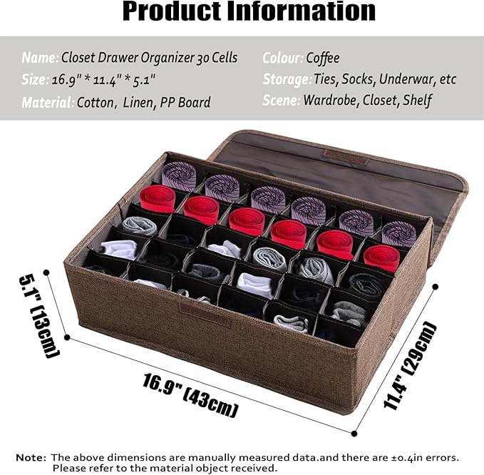 AARAINBOW 2 Packs Underwear Socks Ties Storage Organizer with Lids Foldable Closet Drawer Organizer 60 Cells, Fabric Wardrobe Divider Storage Boxes for Scarves and Lingerie (30 Cell, 2 Coffee)