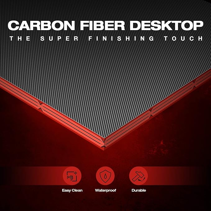 - Super Gaming Style: The amazing carbon fiber material covers the desk, even including the bottom baffle, which makes the whole table full of fabulous gloss and delicate touch. Plus the detail dark red pattern mezzanine and unique z shaped chair legs. Bring you the double enjoyment of vision and touch.