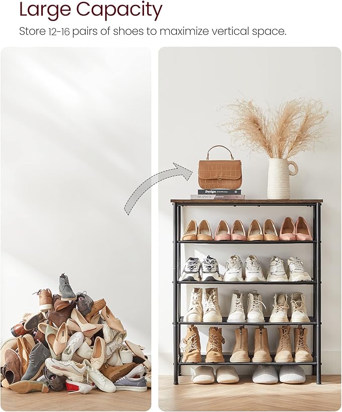 VASAGLE Shoe Rack, 5-Tier Shoe Storage Organizer for Entryway and Closet, Holds 12-16 Pairs of Shoes, 4 Fabric Shelves, Steel Frame, Industrial, Rustic Brown and Black ULBS036B01