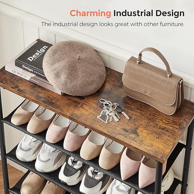 - [What You Get] A shoe organizer with 3 fabric shelves, illustrated instructions, an assembly bag, and an attractive industrial design to add more charm to your entryway