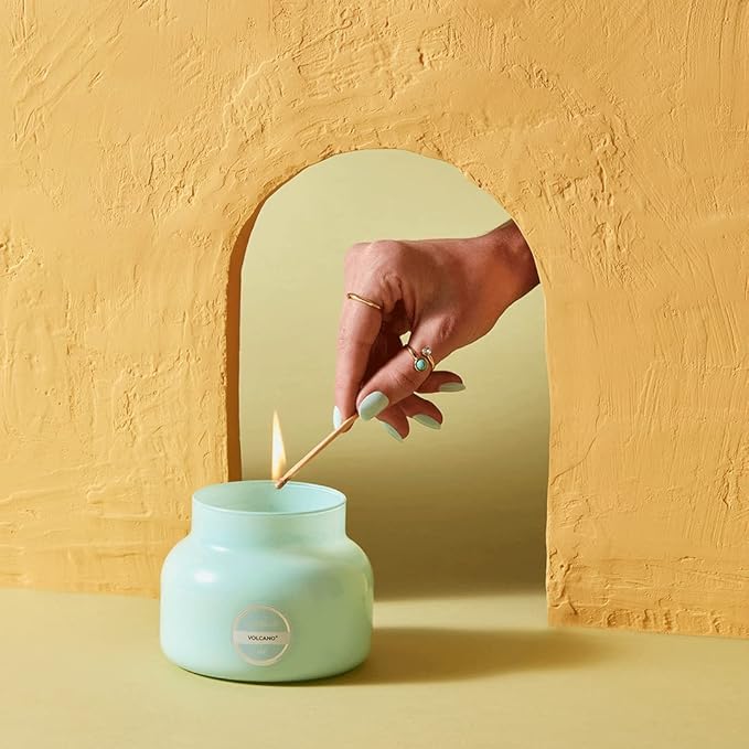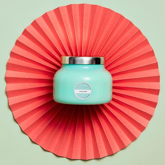 - Aqua Signature Jar Candle: This Volcano scented glass candle is sure to turn heads. Just like a subtle pop of color pulls together an outfit these aqua colored candles will help complete any space.