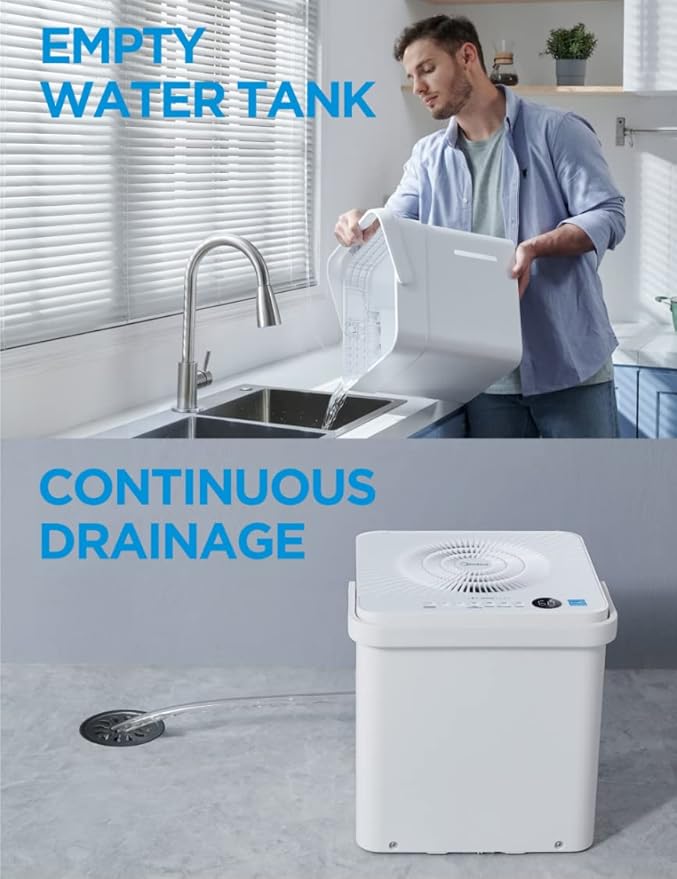 - DEHUMIDIFIER WITH DRAIN HOSE allows CONTINUOUS DRAIN OPTION - Versatile, no-bucket option provides more flexibility to remove moisture. You can remove the water tank and place the unit above the sink using the included drain hose, or position it over a floor drain, near a window or door.