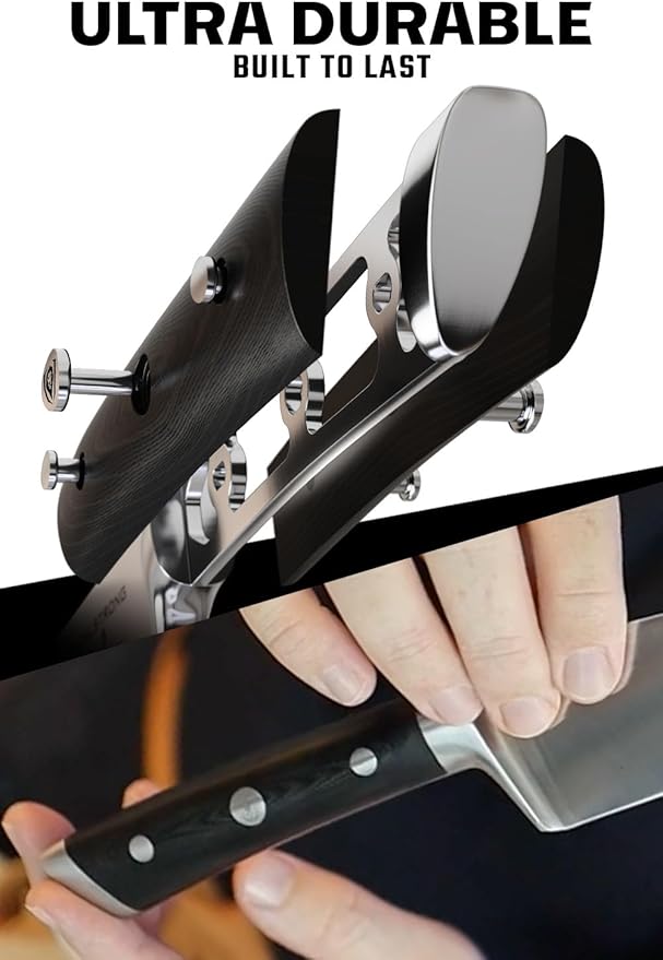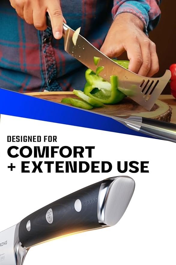 - Crafted of X50CR15MOV high carbon German steel and heat-treated to 56+ HRC, the hand-sharpened, full-tang blade is made to last for a lifetime. Both impact and temperature resistant, you can rely on this knife as a powerful kitchen workhorse, perfect for taking on all kinds of tasks.