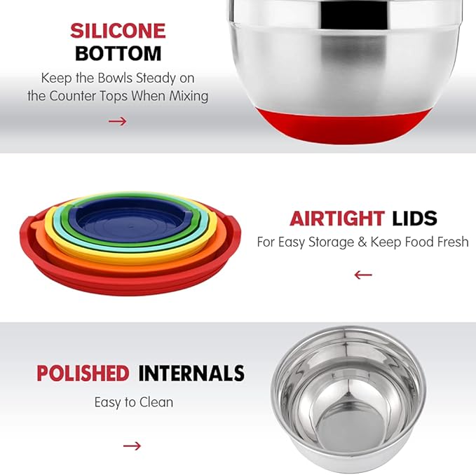 - [MULTIFUNCTION & EASY CLEAN] Steel bowls are prefect to mix, toss salads, stir, whip, knead dough, marinate and store. Ideal present for New home, Easter, Thanksgiving Day, Christmas or any occasion. Simple to clean by hand and dishwasher safe. Please hand-wash the lids to minimize exposure to heat.
