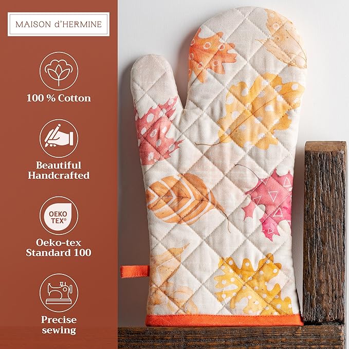 Maison d' Hermine Oven Gloves 100% Cotton Oven Mitt 7" x 13" with Loop Heat Resistant BBQ Cooking Gloves for Thanksgiving Christmas Decorations Baking Handling Hot Pans (Pack of 1, Colours of Autumn)