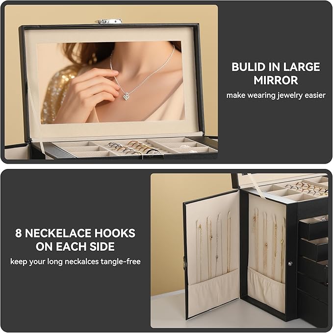 - All-in-One Jewelry Organizer:This huge jewelry box comes with 6 layers different layout organize room and 2 side compartments which include 16 hooks for necklace and 4 pockets that can help to keep your necklaces from getting tangled.In addition,in the top layer,there are a big mirror,6 grid and 7 slots for rings.This jewelry organizer could hold almost all your different jewelry and accessories