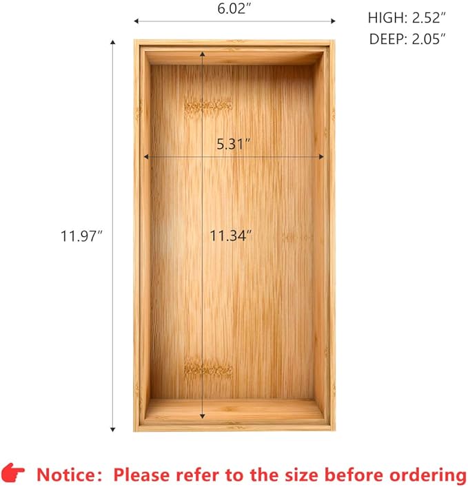 - 【2.5" High Storage Box Organizers】 The height of Bambloom drawer organizer is up to 2.5 inch, which gives more space to storage item like sponns, knife or other little things. Its deep compartmentments make it a practical storage box for drawers. (PLEASE NOTE: Please measure your drawer/space before ordering. If you want the boxes to fit a specific space, allow a little breathing space for any small variations in size that may result during manufacturing.