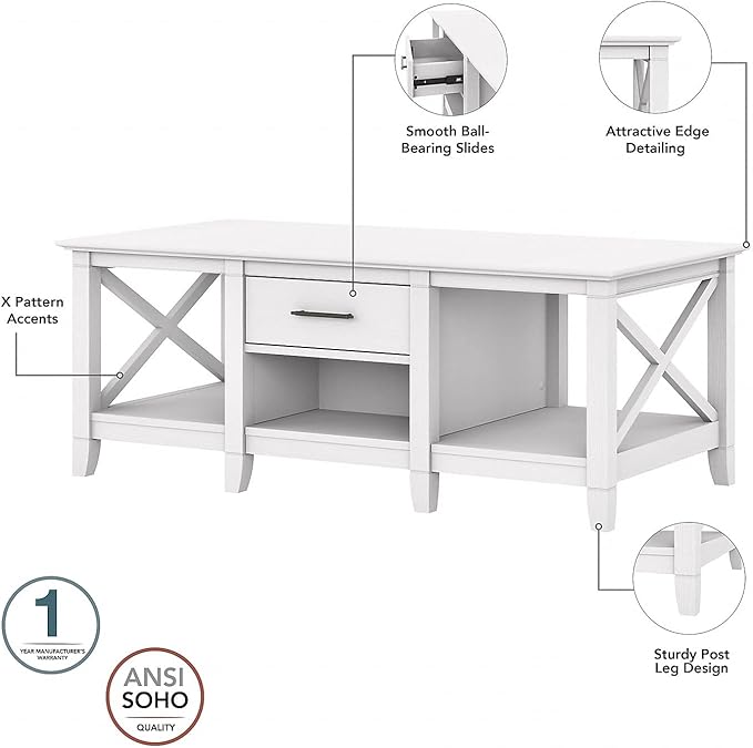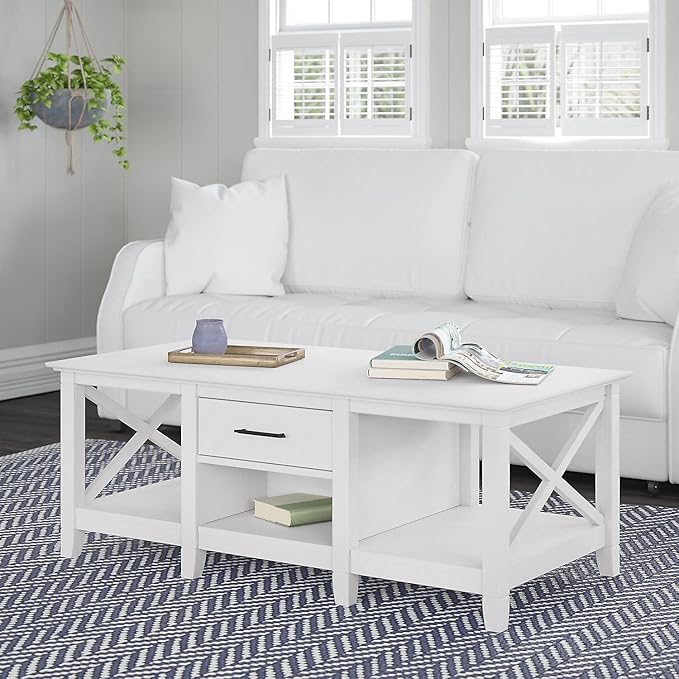 - REFRESHING HOME DECOR: Embrace a casual living space with Bush Furniture's Coffee Tables for Living Room. Our storage coffee table offers a spacious surface for coasters and magazines while box drawers and cubby spaces provide plenty of room for storage.