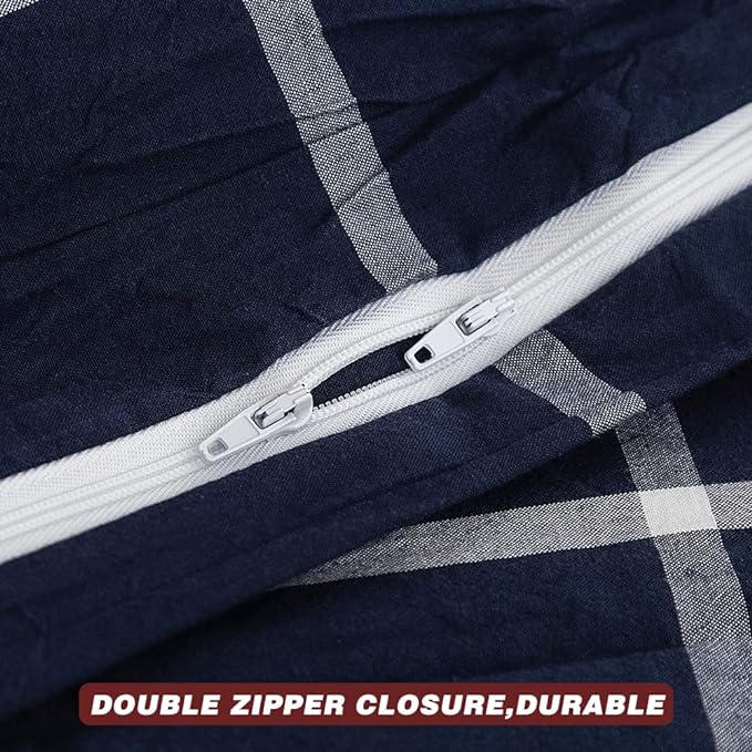 FACE TWO FACE Bedding Duvet Cover Set 3 Pieces 100% Washed Cotton Duvet Cover Linen Like Textured Breathable Durable Soft Comfy (King, Dark Blue Grid)