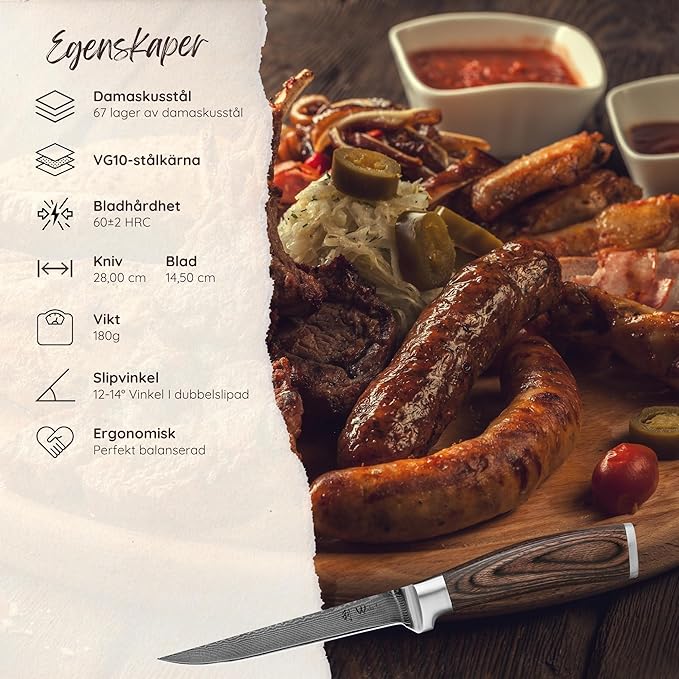 - Razor-Sharp Blade with Superior Edge Retention: The blade is honed to a 12 to 14-degree edge, offering exceptional cutting performance and maintaining its sharpness longer. Thanks to the 67 layers of Damascus steel, this artisan meat-cutting knife lets you spend less time sharpening and more time creating effortless, clean cuts.