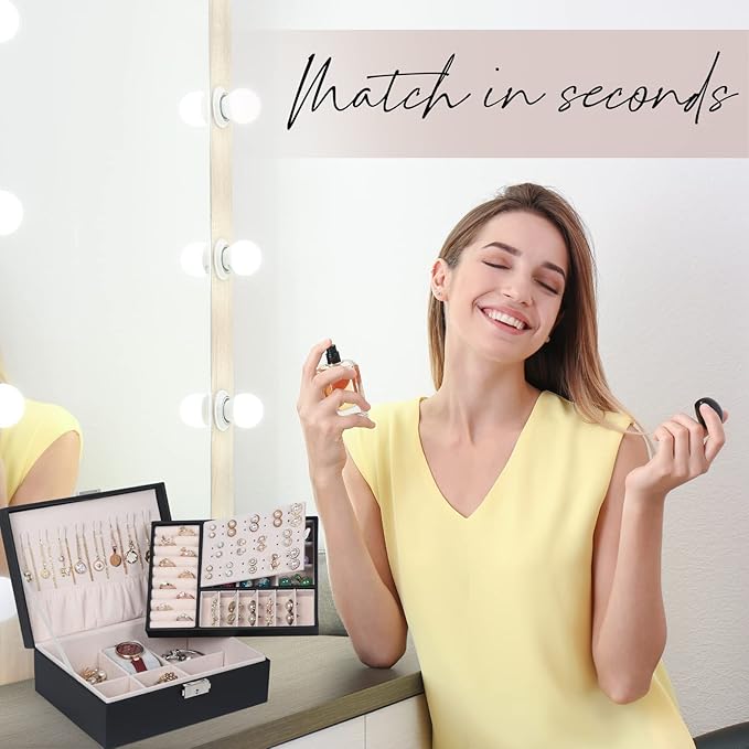 - 【MULTIFUNCTIONAL & PRACTICAL】-- The jewelry organizer box include 2 layers. Top lid with 8 hooks and lower elastic pocket to keep necklaces, chains and pendants in place and tangle free. Middle stackable tray include 15 unique earrings location special for hanging hook earring, 10 ring rolls, 1 adjustable ear stud plate can hold 74 earrings and underneath section. 6 divided bottom compartments to store rings, bracelets,earrings,watches etc. Lots of options to hold various sizes of jewelry