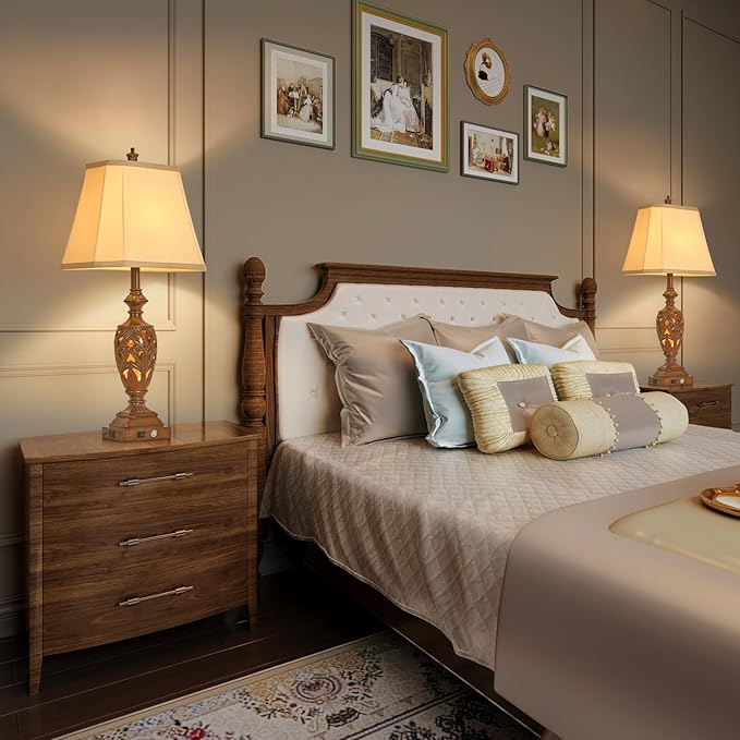 29.5"H Touch Control Traditional Table Lamp with Dual USB Ports, Set of 2, 3-Way Dimmable Hollow Out Leafwork Bronze Wood Finish Vintage Bedside Nightstand Desk Lamps for Living Room,Bedroom