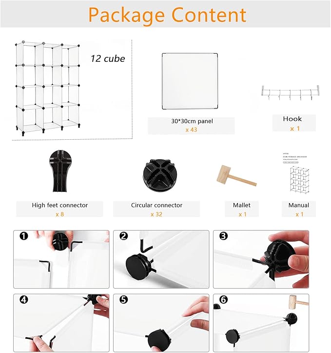AWTATOS Cube Storage Organizer Storage 12 Cube Bookshelf DIY Plastic Closet Storage Shelves with Wooden Mallet, Ideal Storage Solution for Home, Bedroom, Translucent White