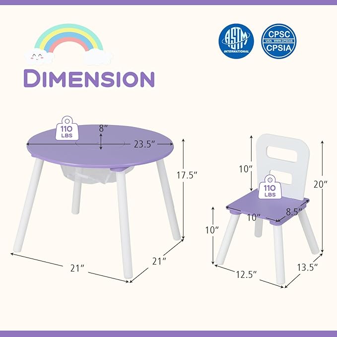 - Safe Material & Stable Structure: Made of sturdy wooden frame, the table and chairs are non-toxic and tasteless, and can be used for a long time. They are certified by ASTM and CPSIA to protect kids' health. The stable solid wood legs ensure no shaking when kids sit on it. The maximum weight capacity of chair is 110 lbs, and table is 110 lbs.