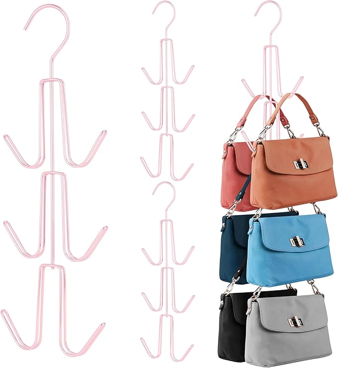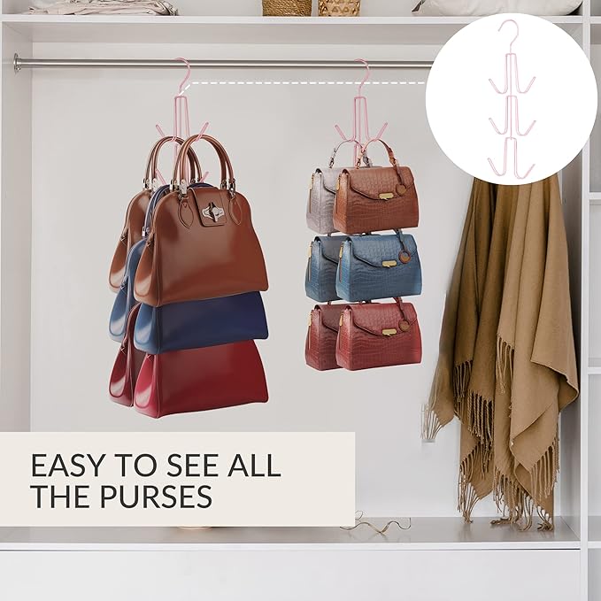 - 360° Rotating Design: The rotating design allows you to choose the hanging angle that best fits your closet space, and it easily swivels to different angles for quick access to your purses or bags.
