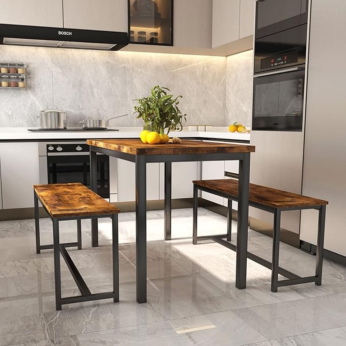 - Modern Design & Dinner with Whole Family: 3 pieces dining table and chairs set comes completely with a spacious table(43.3 x 23.6 x 28.5 inches) and 2 benches(38.5 x 11.8 x 17.5 inches each), modern and stylish design make this 3 pieces dining room set easily blend into anywhere you want in your house and also for small spaces.