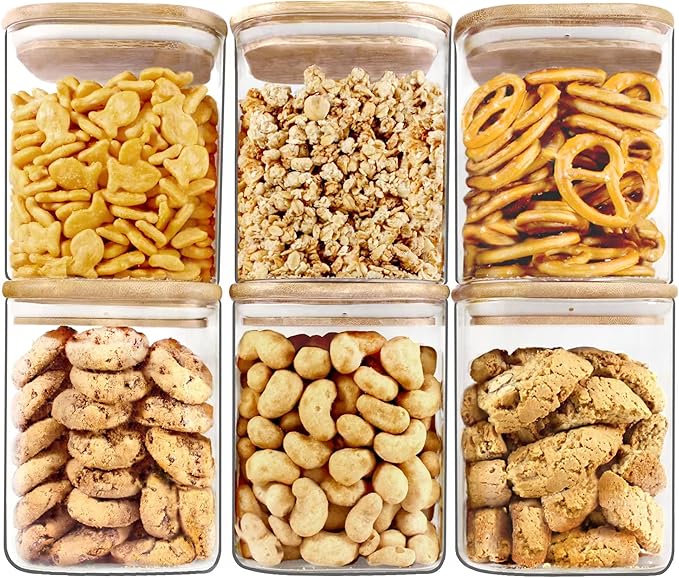 - ✅6 PACK SQUARE SHAPE: Our Square Shape Glass Canister Set comes in a much bigger diameter: Diameter is 4inches, our 6 Pack container volume is 28oz, height is 5 inches. (Capacity measurement does not include lid, pls take out 2-3 oz for lids volume)