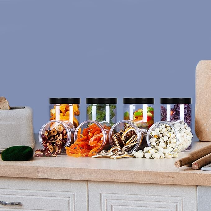 - 8 Pieces 13 OZ Plastic Storage Jar: What you will get is 8 pieces plastic jars with lids clear plastic jars containers with screw on lids.Large capacity and quantity for all your daily storage needs.