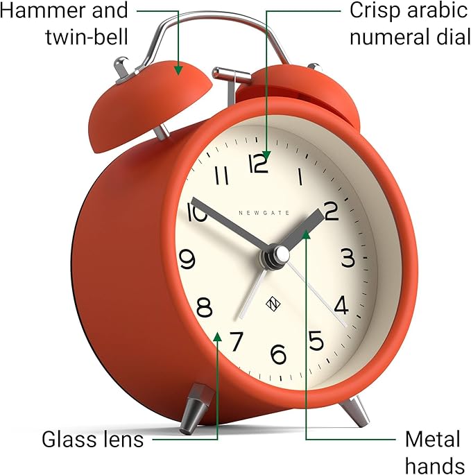 NEWGATE® Charlie Bell Echo Alarm Clock | Modern take on Classic Twin Bell Clock | Orange | Easy to Read Numbers | Ideal for Bedside, Desk or Shelf | Modern Retro Bedroom & Office Accessory