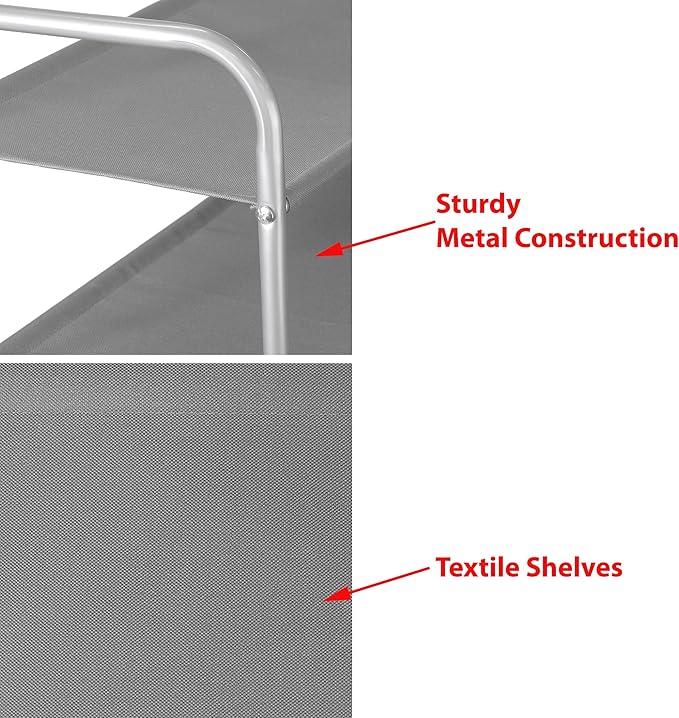 - Sturdy metal construction with washable 600 D polyester fabric, each shelf holding up to 30 lbs.