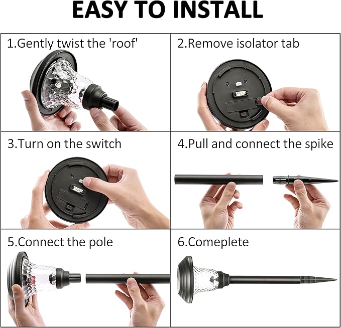 - 【EASY INSTALLATION】Simple assembly as shown in main image, gently twist the top off, turn the switch to “On”, replace the top, then hold the light by the post and push it into the ground, do not push down on the top or hit it, select areas in direct sunlight and install in soft soil, soil can be softened with water if necessary or a small hole can be dug into the soil