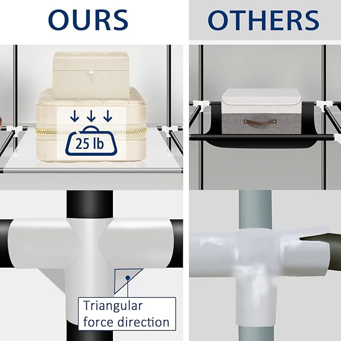 - STURDY STRUCTURE: The portable wardrobe closet made of 25mm sturdy steel tube and strengthened plastic connectors. Stronger, not easily bending able to support heavier weights and it will meet your long term storage needs. Offer firm support for your beautiful clothes in different seasons. PP resin sheet is easy to clean and stronger bearing capacity.