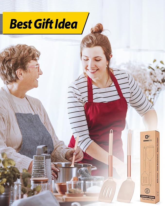 Pack of 2 Silicone Solid Turner, Non Stick Slotted Kitchen Spatulas, High Heat Resistant BPA Free Cooking Utensils, Ideal Cookware for Fish, Eggs, Pancakes(Rose Gold Khaki)