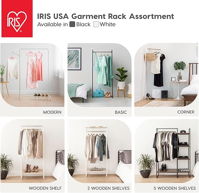 IRIS USA Stylish Corner Clothes Rack for Hanging Clothes, Easy to Assemble, Freestanding Metal Sturdy Garment Rack, Small Space Storage Solution, Modern Versatile Design, Boutique Style, Black