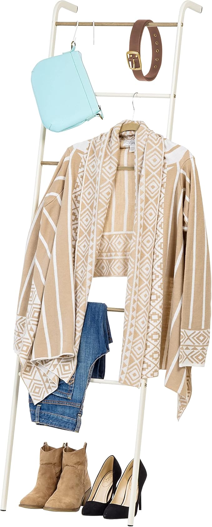 - STYLISH & MODERN: Organize and display your blankets, towels, and throws with the blanket ladder rack. The matte white clothes rack with a wooden décor accent will add a modern aesthetic to your accessory and clothing storage space.