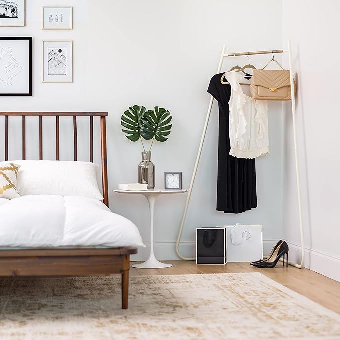 IRIS USA Stylish Corner Clothes Rack for Hanging Clothes, Easy to Assemble, Freestanding Metal Sturdy Garment Rack, Small Space Storage Solution, Modern Versatile Design, Boutique Style, White